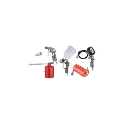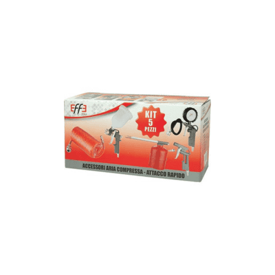 ACCESSORI AC IN KIT ATTACCO RAPIDO EFFE – Composto da 1 pistola con serbatoio in acciaio verniciato da Lt. 1, 1 pistola per gonfiaggio con manometro, 1 pistola per verniciatura con serbatoio da Ml. 500, 1 pistola per soffiaggio, tubo da Mt. 5. Tutti gli accessori sono con attacco rapido.